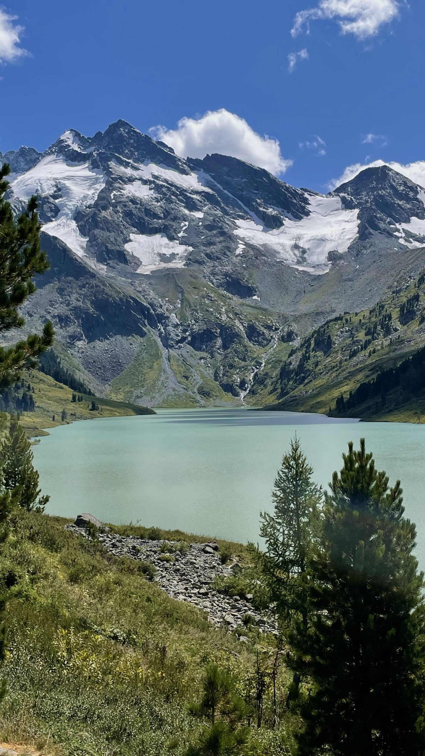 Пройдя совсем рядом с ним, немного забравшись на горку и пройдя еще пару сотен метров, мы обнаружим озеро Куйгук – настоящую жемчужину Алтая, настолько оно невероятно красивое. В длину около километра, в ширину около 500 м., с волшебно бирюзовым цветом воды из-за смешивания с ледниковыми водами и лечебной синей глиной. Вполне вероятно, вы скажете, что это самое красивое озеро, из всех виденных вами! Здесь хочется замереть и всей душой впитать эту атмосферу невероятного озера, окруженного со всех сторон молчаливыми серыми горами с белоснежными ледниками.