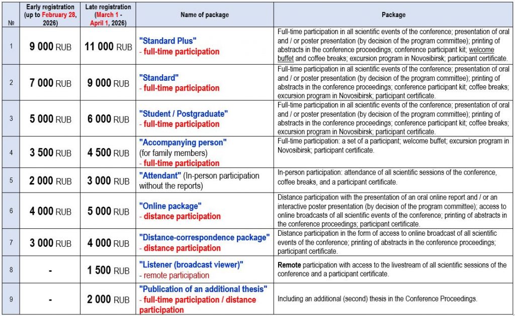 The table shows the registration fees for participation in the BGRS/SB-2026 conference. Prices are given in rubles. For convenience, links to currency converters (EUR, CNY, USD) are given below: