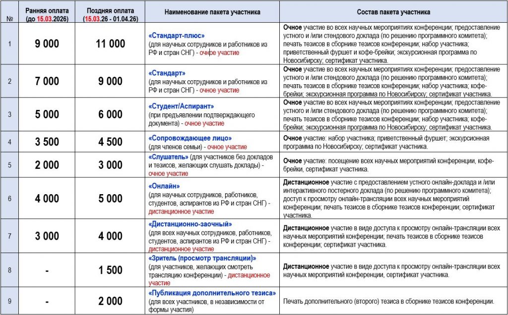 В таблице приведены размеры пакетов (регистрационных взносов) на участие.